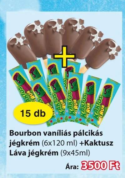 6 db, vaníliás jégkrém, tejcsoki bevonattal (6x120ml.) + 9 db. kaktusz láva jégkrém (9x45ml.)